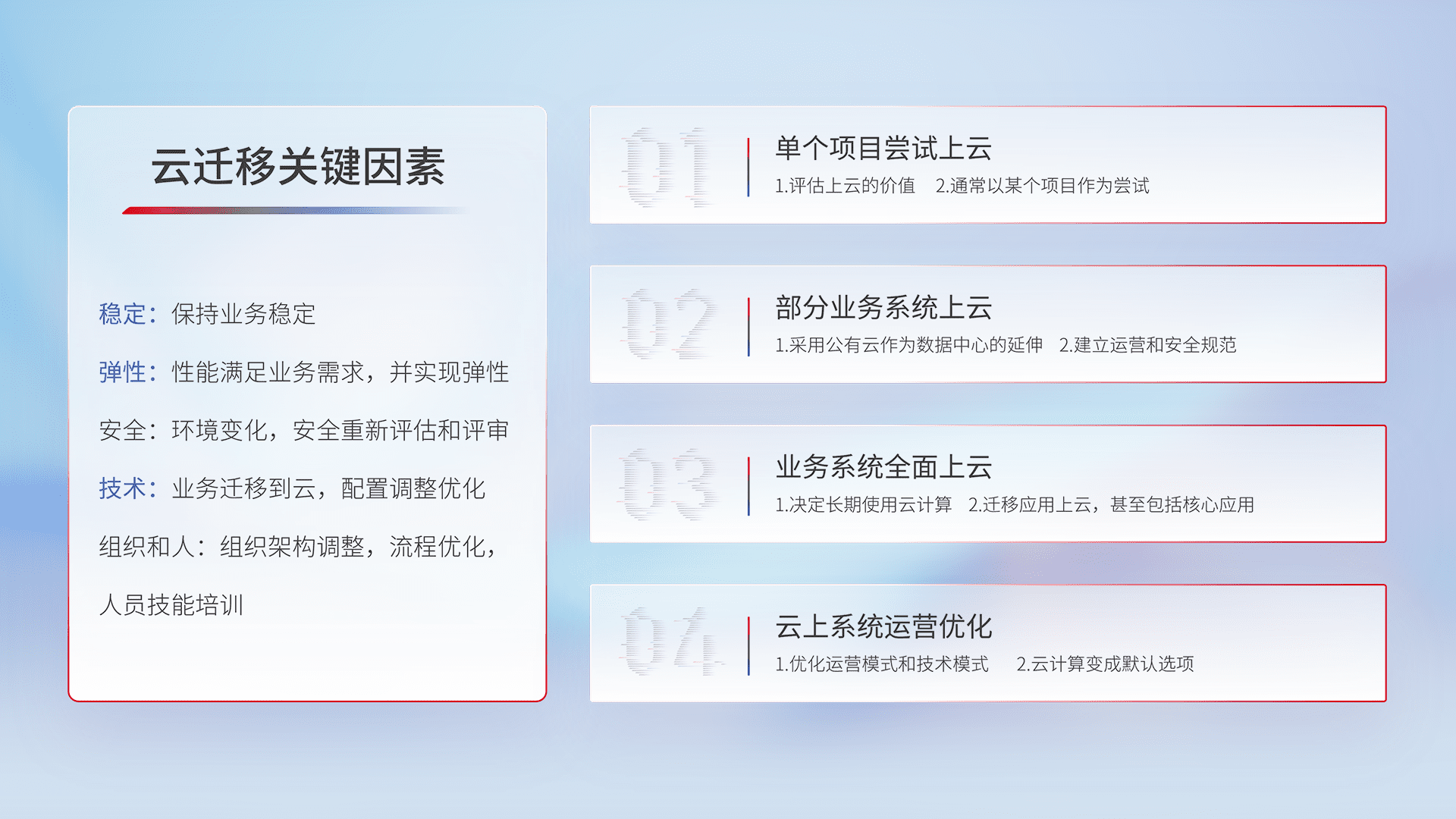结合实际业务,,,从规划设计、、、、云平台选型、、云原生改造、、数据迁移、、、集成交付,,,,迁移全过程为客户识别最佳上云路径,,做好风险识别管理,,设计网络架构、、身份权限、、安全审计合规、、、、操作审计、、日志审计、、监控告警策略、、、、多站点容灾设计等,,对云上基础设施进行整体规划,,,,提升IT治理水平,,,以满足弹性、、高可用、、、、高性能的需求。。。。
