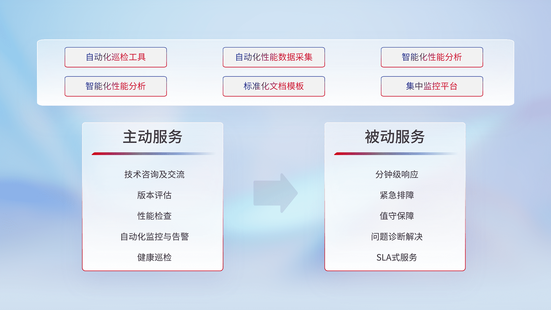 智能化工具和标准化文档,,,保障服务质量,,,提供主动服务(包含技术咨询、、版本评估、、、、性能检查、、自动化监控与告警、、、、健康巡检)和被动服务包含(分钟级响应、、紧急排障、、、、值守保障、、、、问题诊断解决、、SLA服务)。。